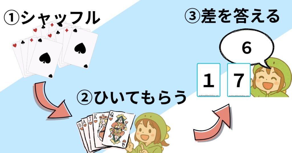 2枚のカードに書かれてある数字をみて、大きい方と小さい方との差それらを答えるゲーム。