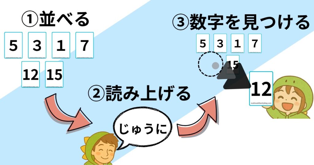 ③お子さんに読み上げた数字のカードを見つけてもらいましょう。