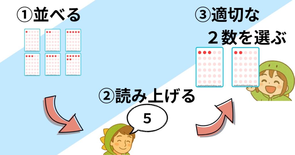 ③お子さんは、その好きな数の個数に◯の個数の合計が等しくなるように、2枚のカードを見つける。