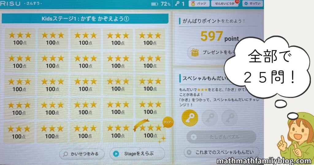 また、ステージ1の課題数は25題で、所要時間も30分程度です。