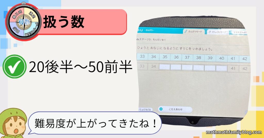どんな数の並びかを丁寧に学ぶことで、50前半までの数を理解できるようにしていますね。